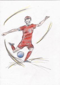 Die Spielerin im ersten Bild hat einen zu langen Arm, aber trotzdem gefällt mir die Zeichnung. Coloriert habe ich mit Aquarellbuntstiften.
