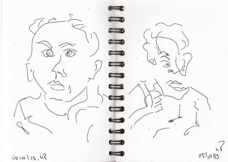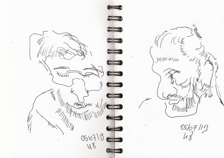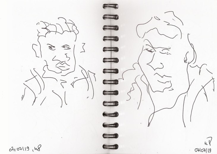 Wenn ich schreibe, ich zeichnete „blind“, dann habe ich entweder nur auf die zu zeichnende Person und gar nicht aufs Papier gesehen. Teilweise sind hier Körperpartien „verrutscht“, weil ich ja nicht sehe, wo ich mein Stift wieder ansetze. Bei manchen Zeichnungen mache ich mir diesen Umstand auch zunutze, indem ich verschiedene Personen über- und nebeneinander auf ein Blatt zeichne, so dass am Ende auf dem Papier genau solch ein Gewusel entstanden ist, wie zur Hauptverkehszeit in der S- oder U-Bahn.