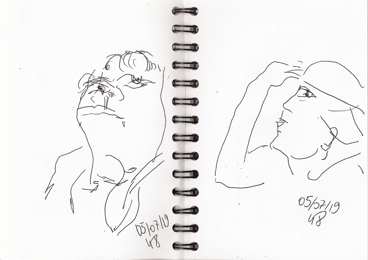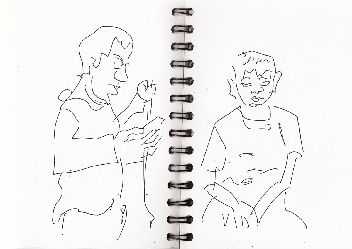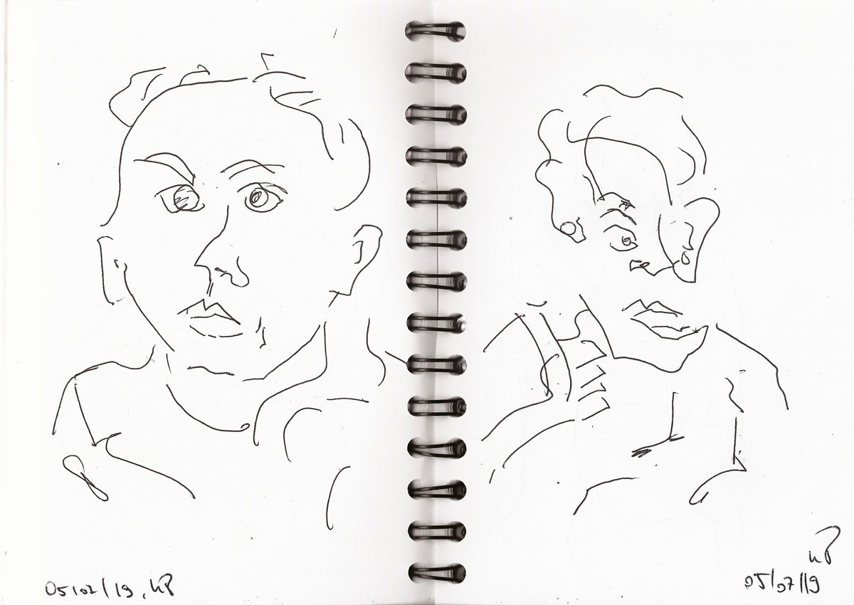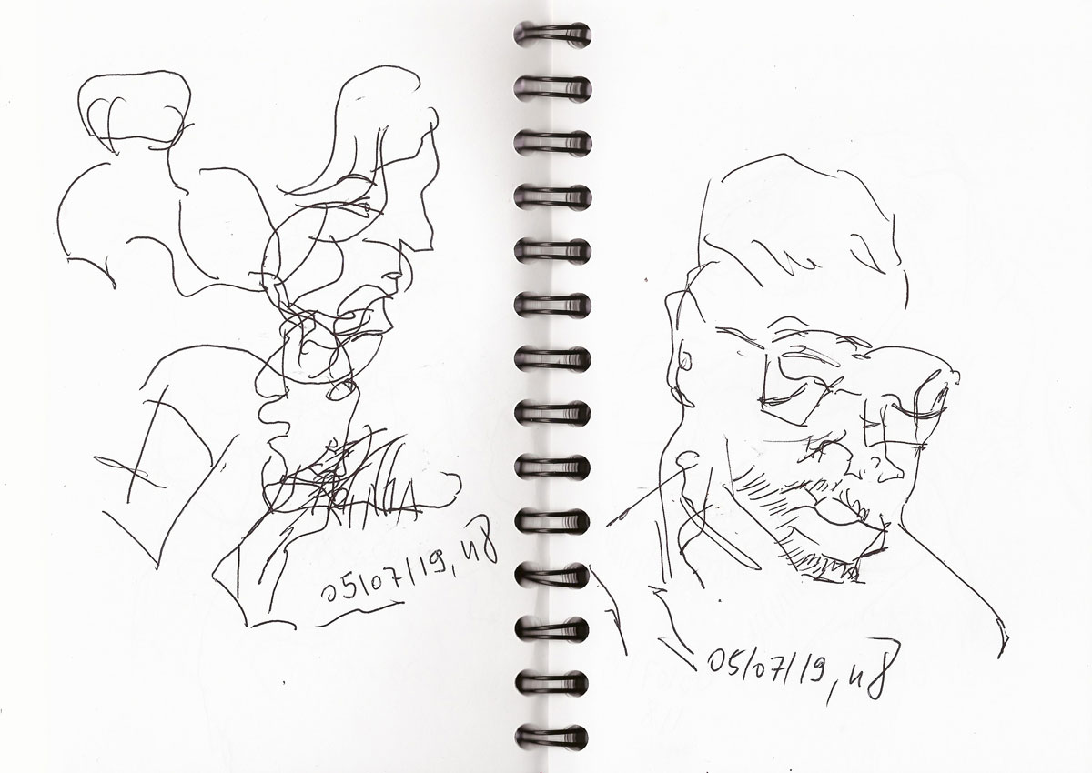 Wenn ich schreibe, ich zeichnete „blind“, dann habe ich entweder nur auf die zu zeichnende Person und gar nicht aufs Papier gesehen. Teilweise sind hier Körperpartien „verrutscht“, weil ich ja nicht sehe, wo ich mein Stift wieder ansetze. Bei manchen Zeichnungen mache ich mir diesen Umstand auch zunutze, indem ich verschiedene Personen über- und nebeneinander auf ein Blatt zeichne, so dass am Ende auf dem Papier genau solch ein Gewusel entstanden ist, wie zur Hauptverkehszeit in der S- oder U-Bahn.