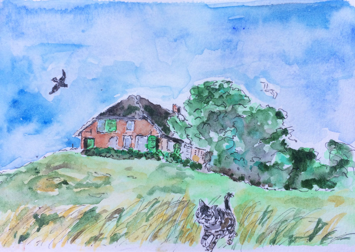 Diese kleine Zeichnung schenkten wir unser liebenswerten Vermieterin, in deren Haus wir uns für die Urlaubstage einmieten konnten. Mit aufs Bild musste selbstredend die Hofkatze, die uns wohlgesonnen war.