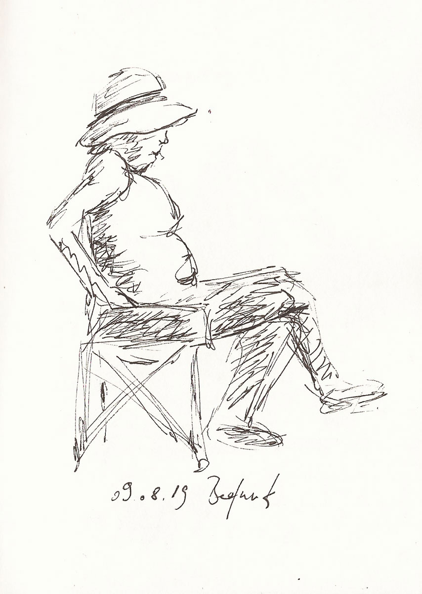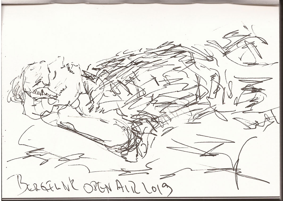 Chillen beim #Bergfunkopenair, Zeichnung von Ines Udelnow, Skizzenbuch A6, Zeichnung mit Fineliner, 10.8.2019