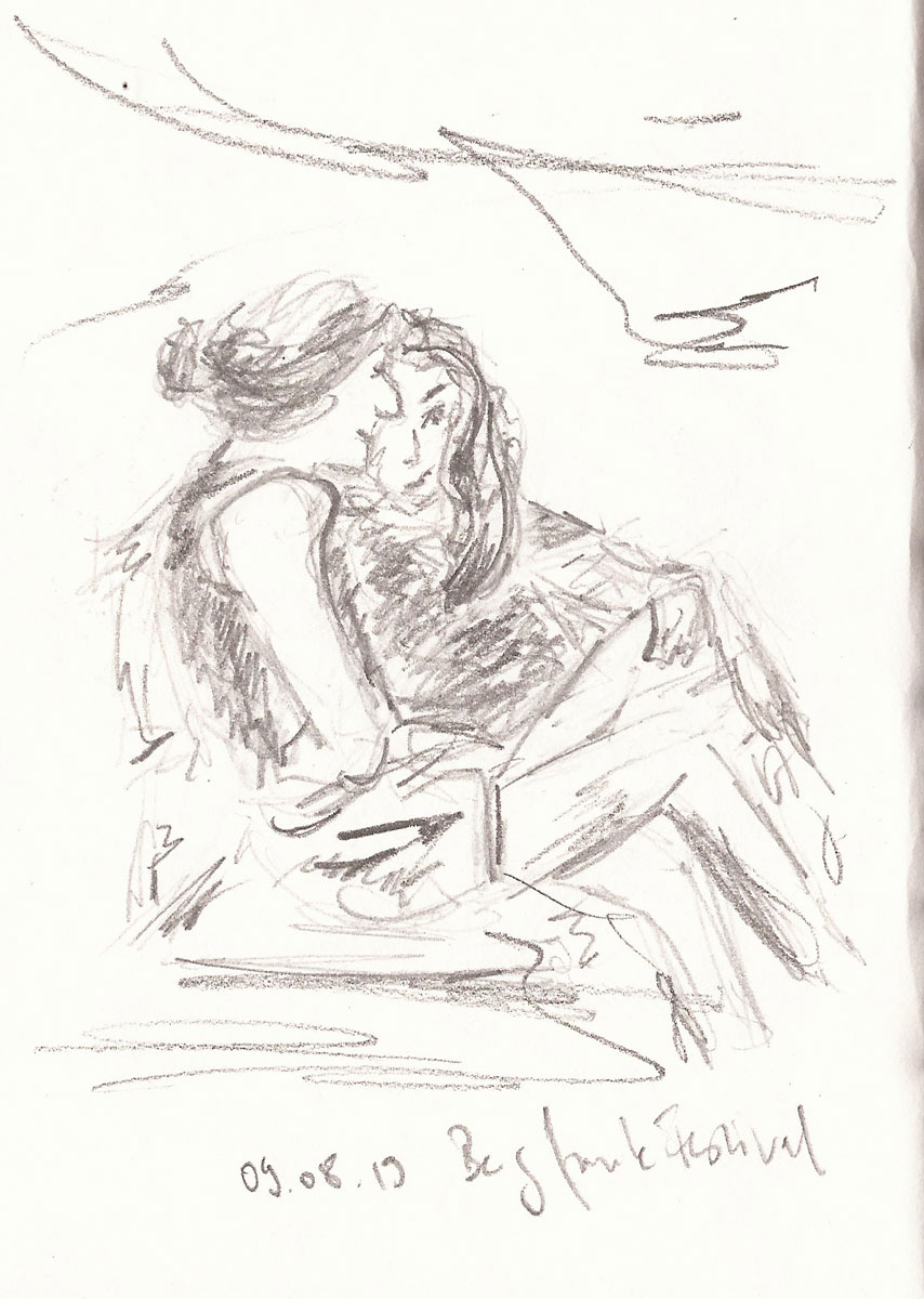 Besucherinnen beim #Bergfunkopenair, Zeichnung von Ines Udelnow, Skizzenbuch A6, Bleistift 09.8.2019