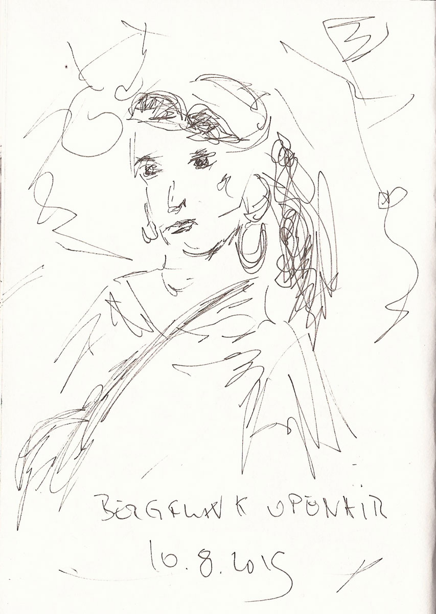 Besucherin beim #Bergfunkopenair, Zeichnung von Ines Udelnow, Skizzenbuch A6, Kugelschreiber, 10.8.2019