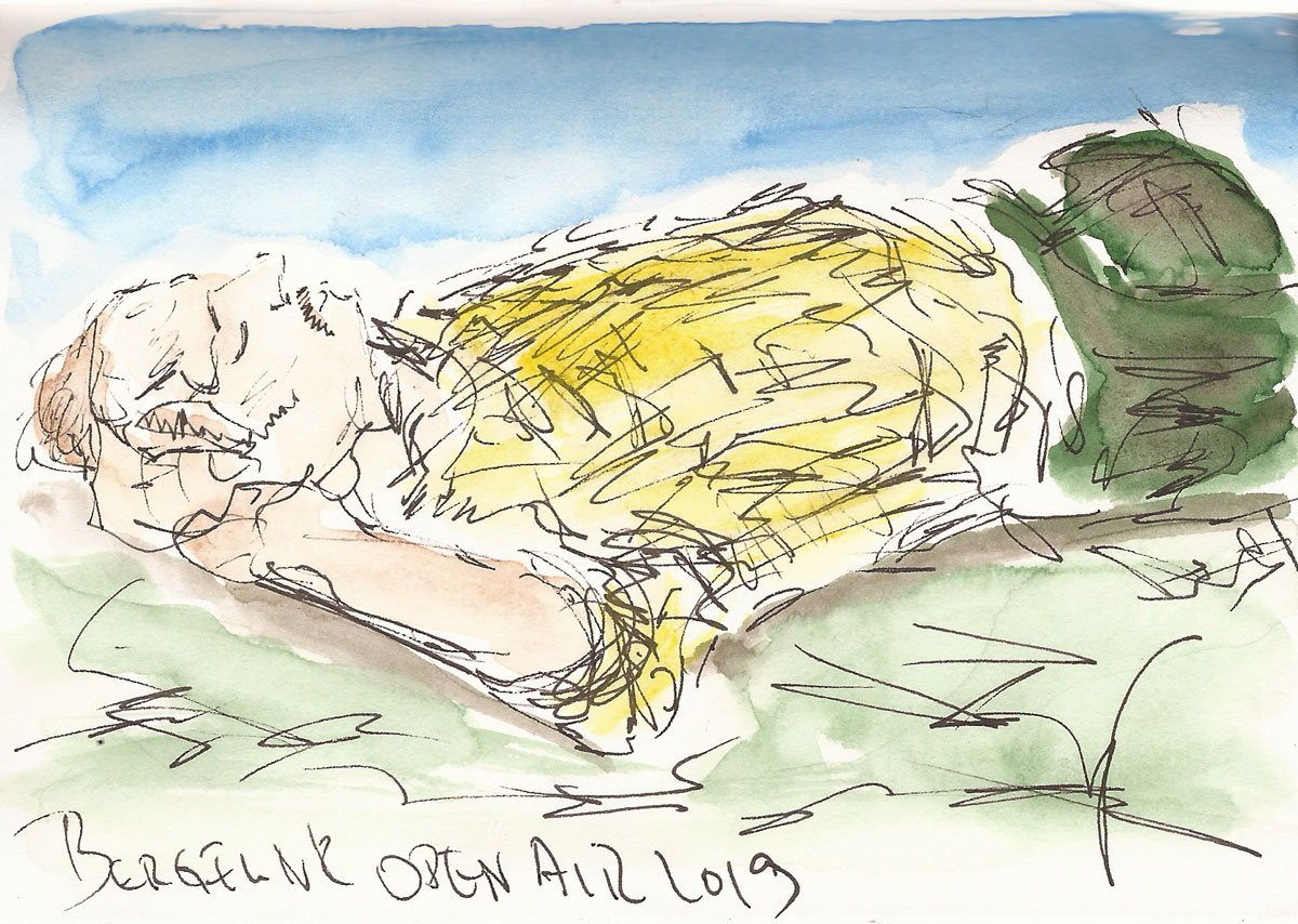 Chillen beim #Bergfunkopenair, Zeichnung von Ines Udelnow, Skizzenbuch A6, Zeichnung mit Fineliner und nachträgliche Kolorierung mit Aquarellfarbe, 10.8.2019