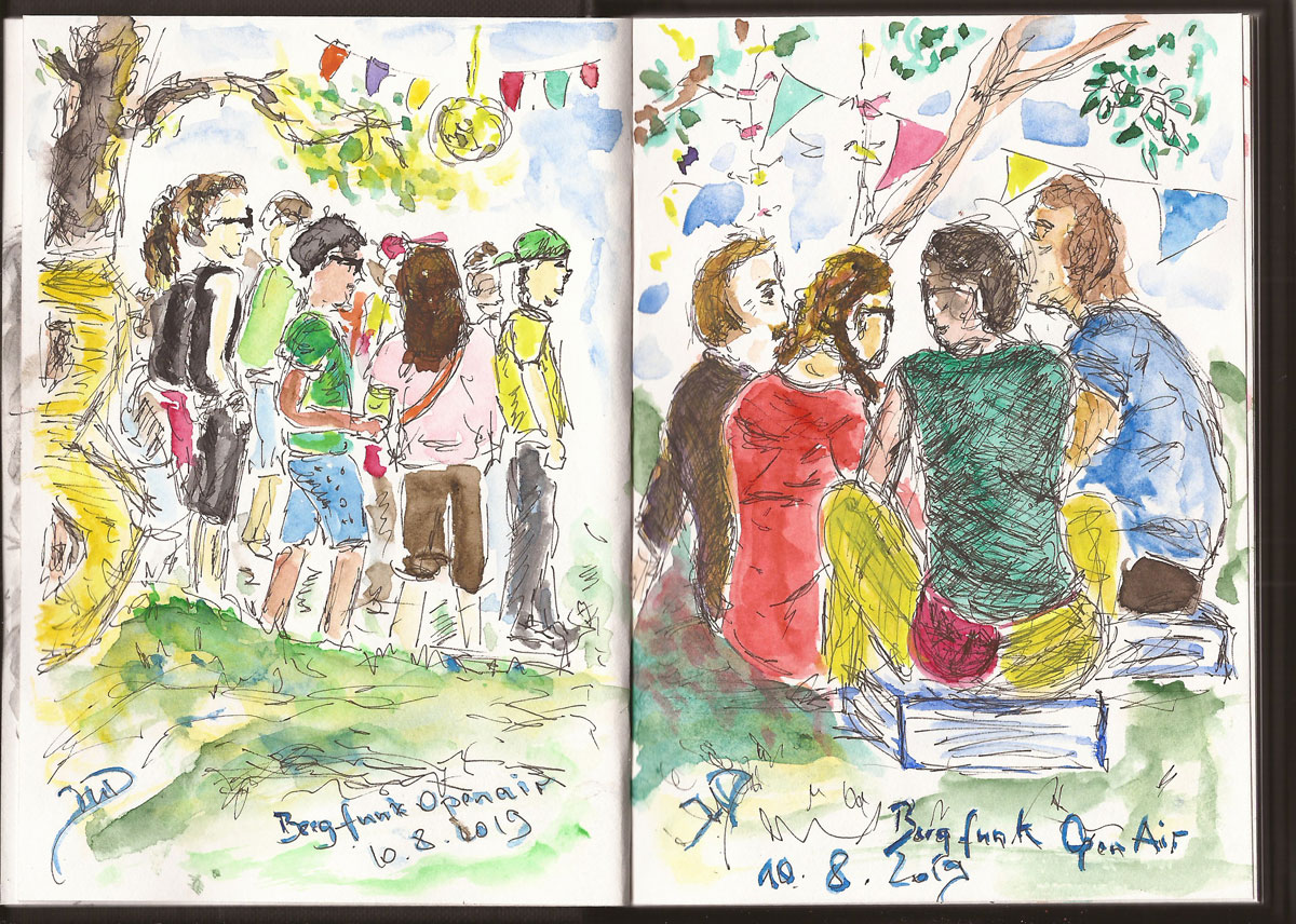 Beim #Bergfunkopenair, Zeichnung von Ines Udelnow, Skizzenbuch A6, Zeichnung mit Fineliner und nachträgliche Kolorierung, 10.8.2019