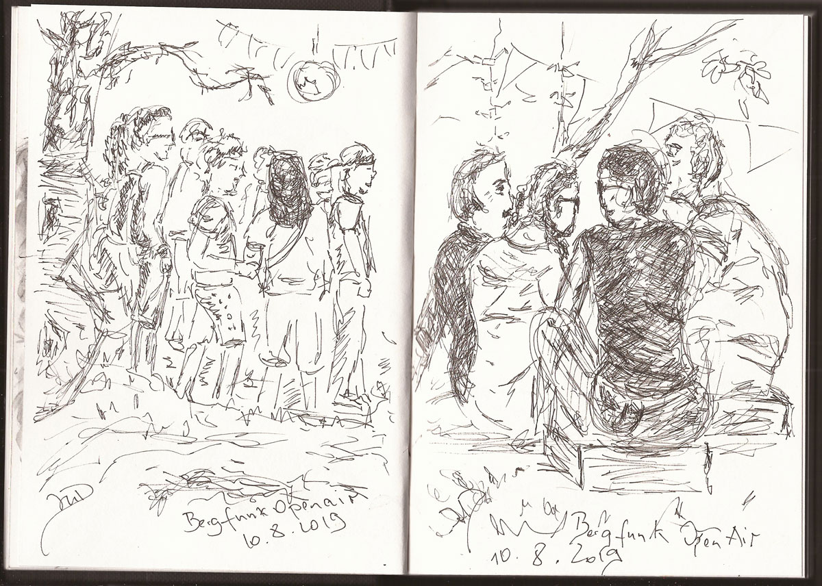 Beim #Bergfunkopenair, Zeichnung von Ines Udelnow, Skizzenbuch A6, Zeichnung mit Fineliner, 10.8.2019