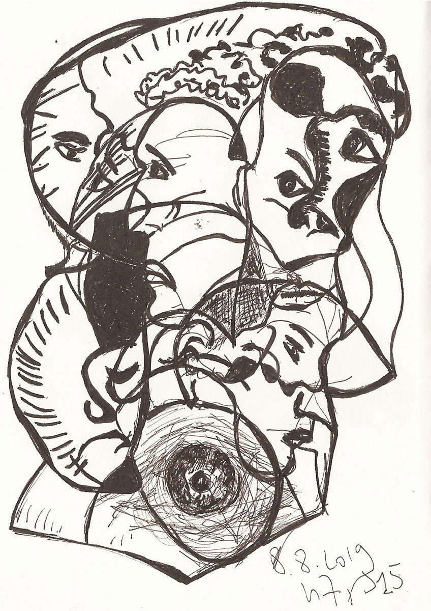 In der S-Bahn „blind gezeichnet“, die einzelnen Skizzen neben- und übereinander gelegt. Dann, neulich im Wartezimmer bei der Ärztin, die Zeichnungen mit Linien verbunden, verstärkt, geschwärzt. Zeichnen hilft wie immer gegen die Wartezimmernervosität. Der Termin bei der zugewandten und offenbar am Patientinnenwohl sehr interessierten Ärztin ist nun regelmäßige Routine zwar; und dennoch nicht routiniert.