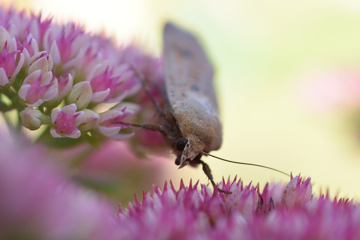 Bei dem Falter bin ich mir noch weniger sicher – es wird sich vielleicht um einen Eulenfalter handeln, aber um welchen genau? Ich habe bei meiner kleinen Netzrecherche kein Foto eines Falters mit identischer Form und Färbung gefunden, muss aber auch zugeben, dass ich nicht das Sitzfleisch für eine allzu ausführliche PC-Recherche habe. Falls Ihr den Falter bestimmen könnt, freue ich mich über einen Kommentar.