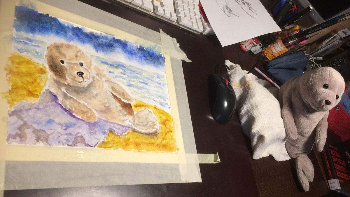 Übers Wochenende haust bei uns eine kleine Stofftierrobbe. Sie ist so niedlich, dass das Kind in mir sie am liebsten für sich selbst hätte. Das erwachsene Ich macht ein kleines Fotoshooting mit Einhörnern und drapiert Robbie dann für ein kleines Aquarell. Das Kind, das das Stofftier zum Zeichnen hergegeben hat, erhob bereits Anspruch auf das entstehende Bild. Im Prinzip habe ich nichts dagegen; wenn da nicht Fräulein Leistungsdruck wäre, die nun ihren Senf in die traute Runde wirft: das darfst Du nun aber erst recht nicht verpatzen, wo Du das Bild bereits versprochen hast!