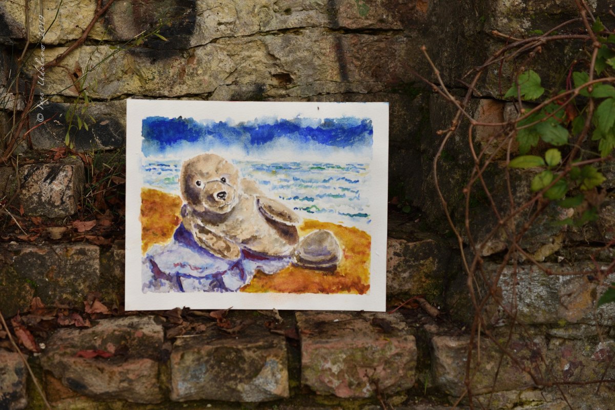 Das kleine Aquarell der kleinen töchterlichen Plüschrobbe in seiner finalen Version, wieder draußen im Senkgarten fotografiert, wo der Herbst die alte Mauer weiter entlaubt.