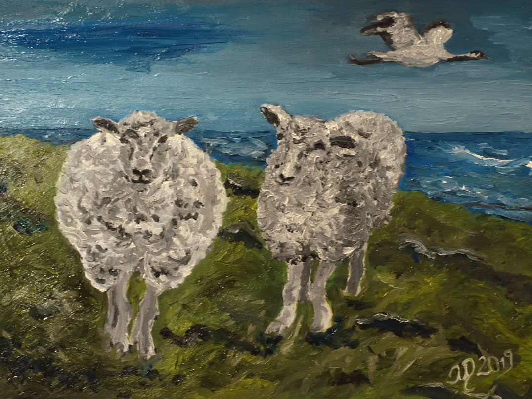 Ölgemälde. Zwei Schafe und der neunzehnte Kranich