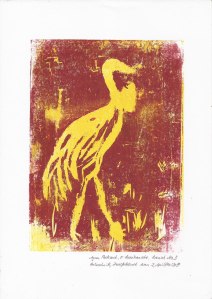 Kranich, Holzdruck; © Ines Udelnow 2019