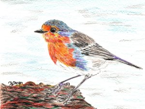 Buntstiftzeichnung. Rotkehlchen