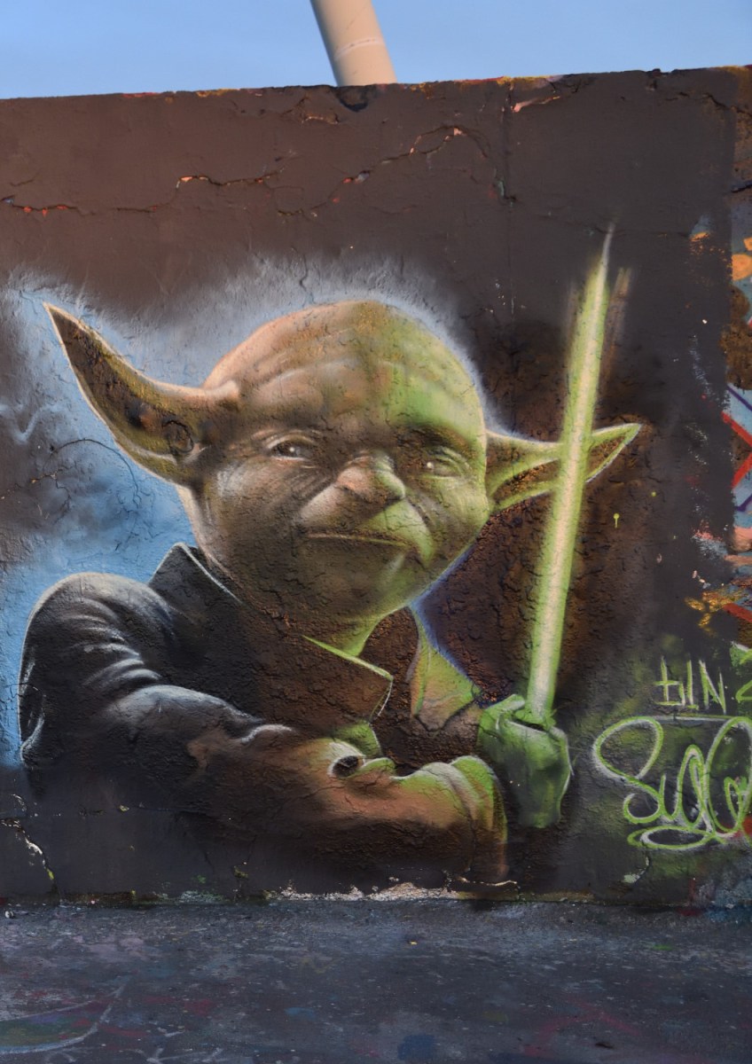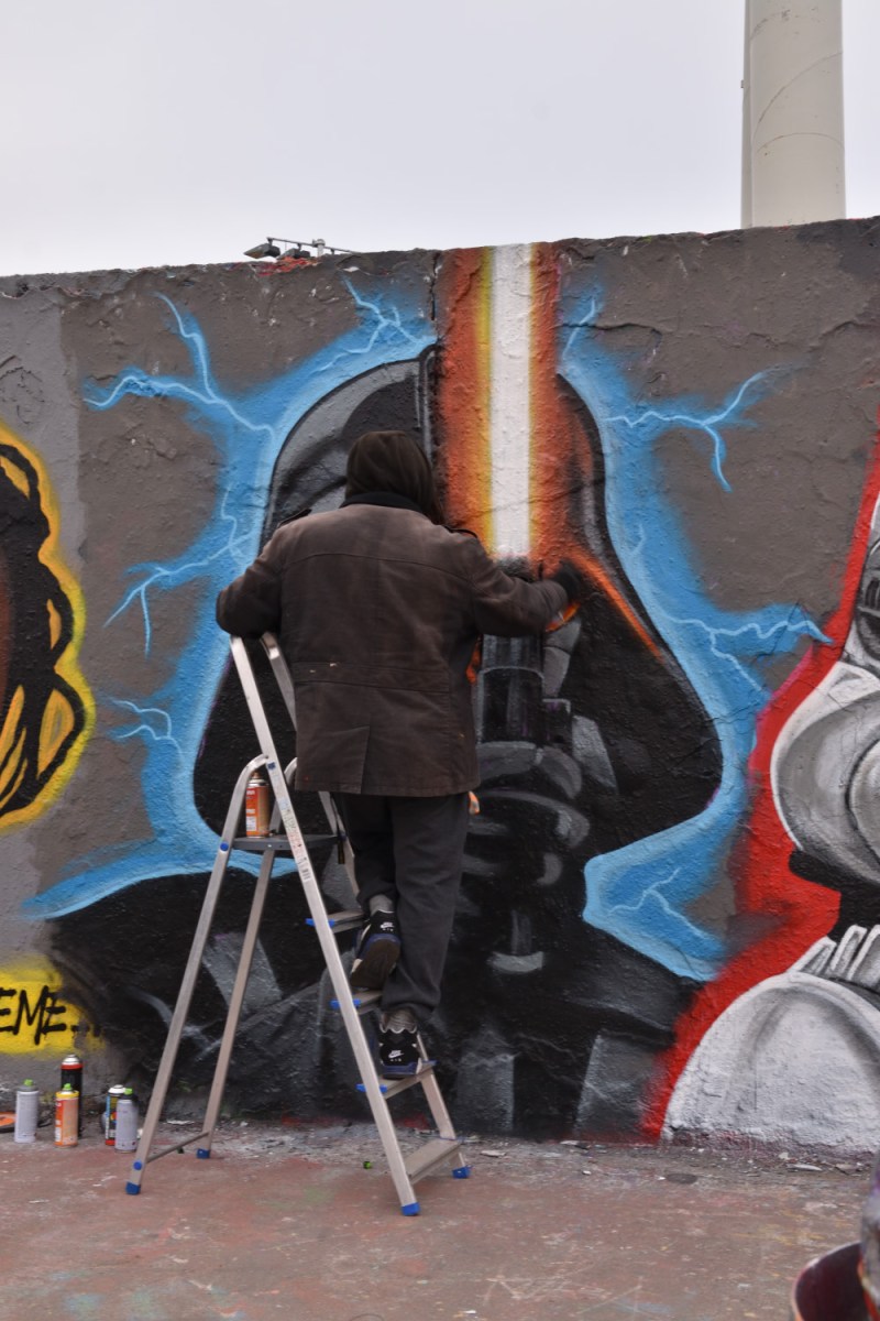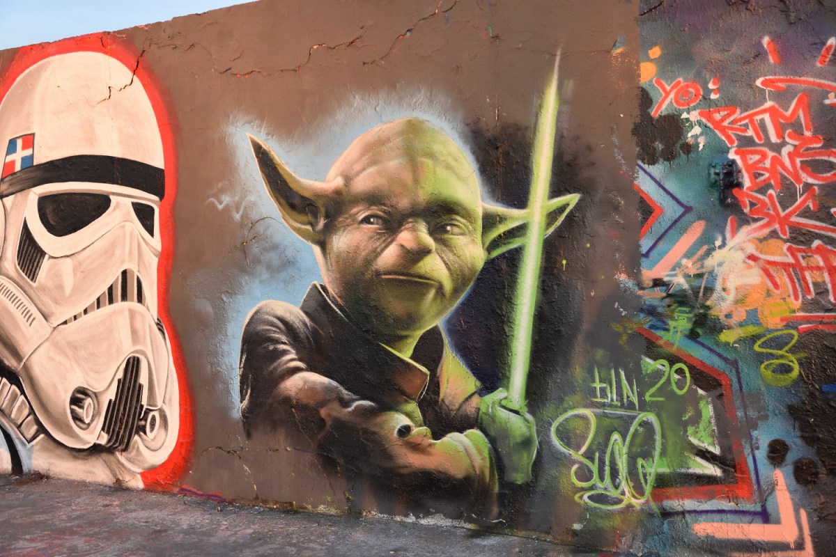 Wenn ich bei Instagram stöbere, sind seine Figuren aus StarWars die meistfotografiertesten und in den Sozialen Netzwerken meistgeposteten. Ich bin selbst kein ausgesprochener Fan der Filmreihe, aber von begeisterten Anhängern umgeben und so sprangen auch mir diese Sprühwerke natürlich gleich ins Auge. Am besten gefällt mir dazu aber die Botschaft: DON’T START WARS.