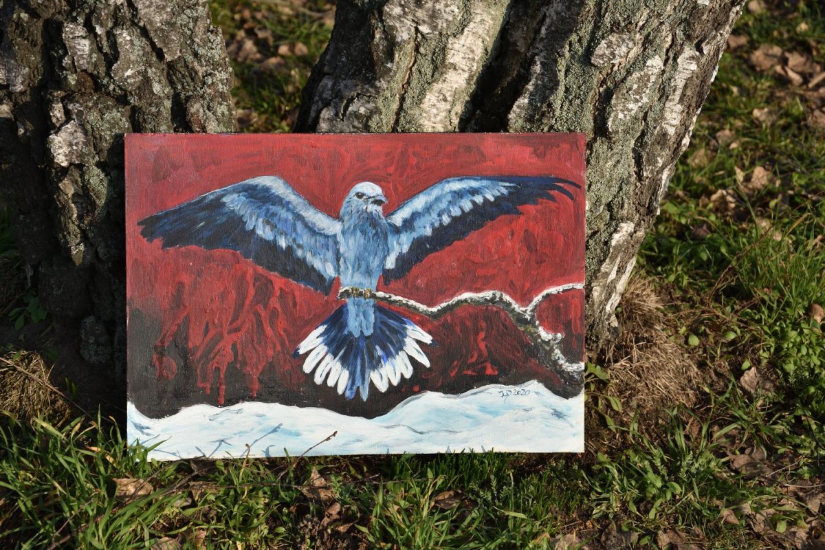 Erinnert Ihr Euch an die wundervollen Fotografien, die Werner, der Vogelknipser, uns aus Bulgarien mitbrachte (>>KLICK<<)? Ich jedenfalls fand sie sehr inspirierend und das Foto der Blauracke mit den ausgestreckten Flügeln (>>KLICK<<) adaptierte ich dann auch zu einem eigenen Gemälde.