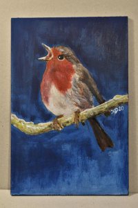 Rotkehlchen, Gouache auf Zigarrenkistenbrettchen, Februar 2020