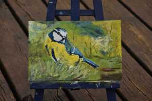 Kunst auf Zigarrenkistenbrettchen. Blaumeise