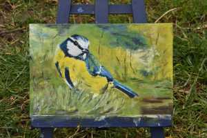 Kunst auf Zigarrenkistenbrettchen. Blaumeise
