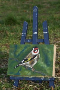 Distelfink. Gouache auf Zigarrenkistenholz, Mrz 2020, Format: c