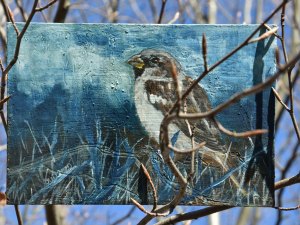 Kunst auf Zigarrenkistenbrettchen. Haussperling