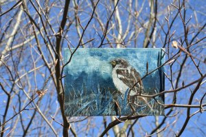 Kunst auf Zigarrenkistenbrettchen. Haussperling