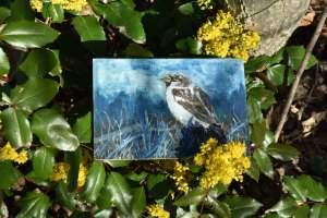 Kunst auf Zigarrenkistenbrettchen. Haussperling