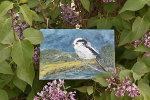 Kunst auf Zigarrenkistenbrettchen. Schwanzmeise