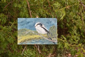 Kunst auf Zigarrenkistenbrettchen. Schwanzmeise