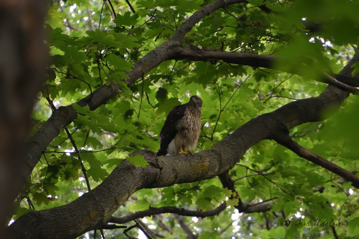 Die hier gezeigten Bilder stammen vom gestrigen Vormittag, als ich das Glück hatte, den jungen Vögeln entsprechend foto-nahe zu kommen. Heute morgen machte ich eine Parklaufrunde ohne Fotoapparat und entdeckte einen jungen Habicht auf einem Baum, der von einer Amsel beschimpft wurde. Sie zeterte und zeterte, flatterte um ihn herum, flog direkt auf ihn zu. Der Habicht versuchte sich in stoischer Gelassenheit. Erst nach einer Weile setzte er an, der Amsel nachzusetzen, war aber zu wenig erfahren und plumpste unverrichteter Dinge wieder auf dem nächsten Ast und die Amsel schimpfte – im Chor mit ihren Artgenossinnen – weiter.