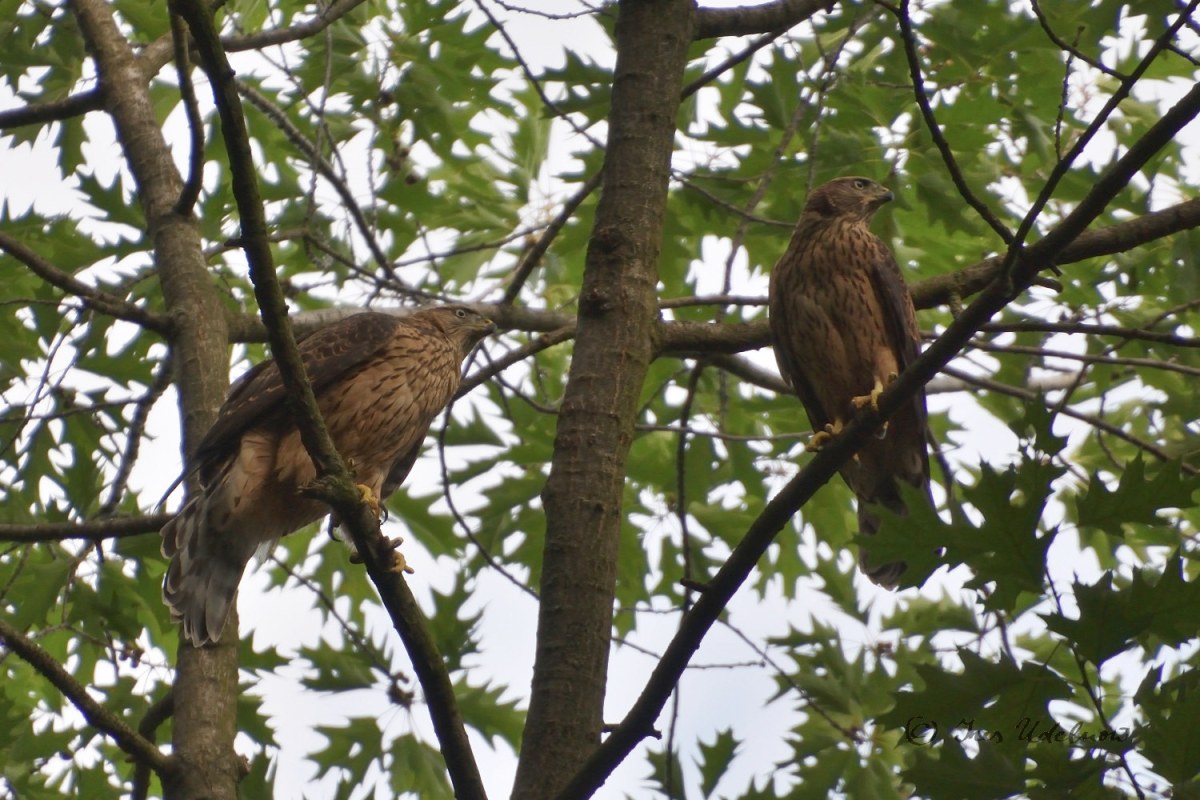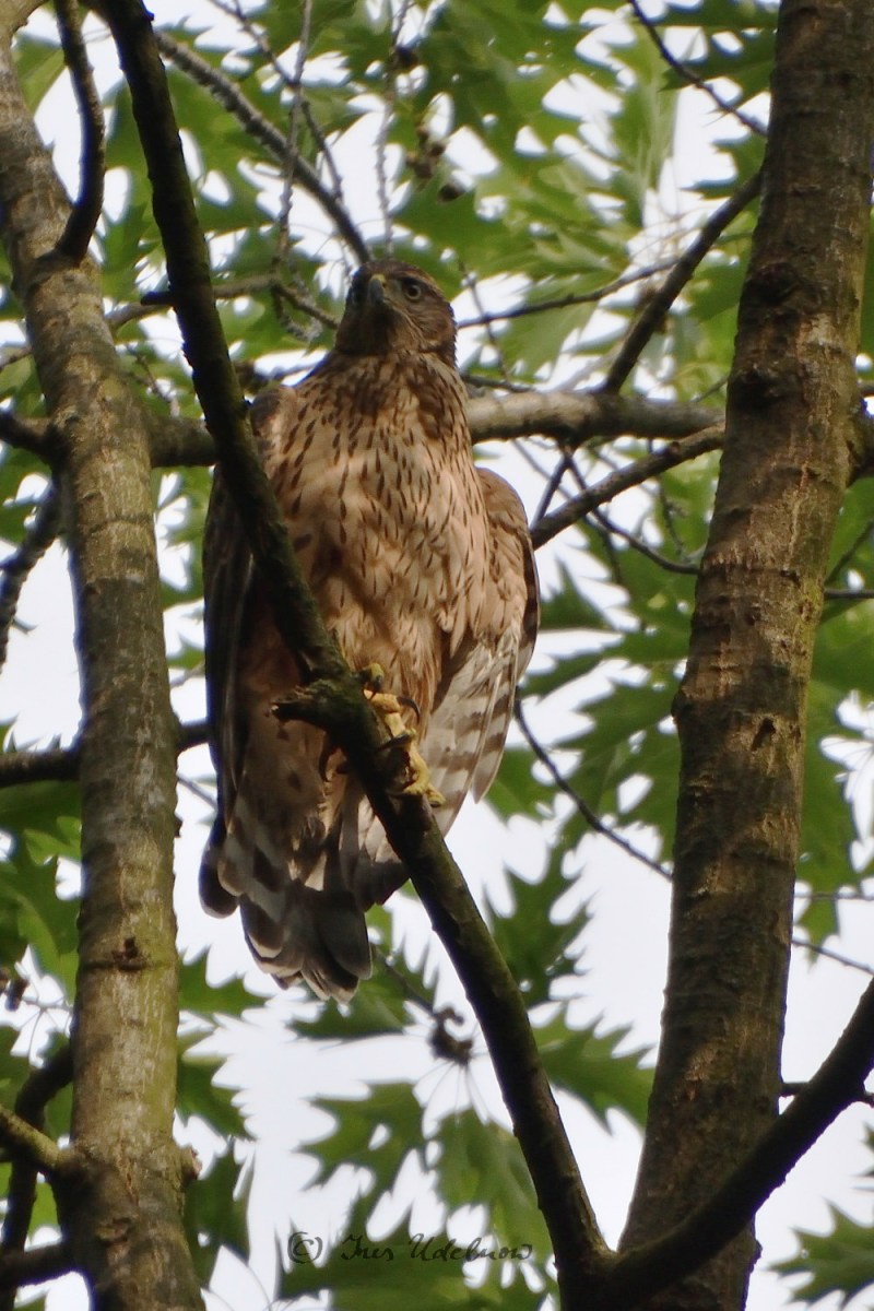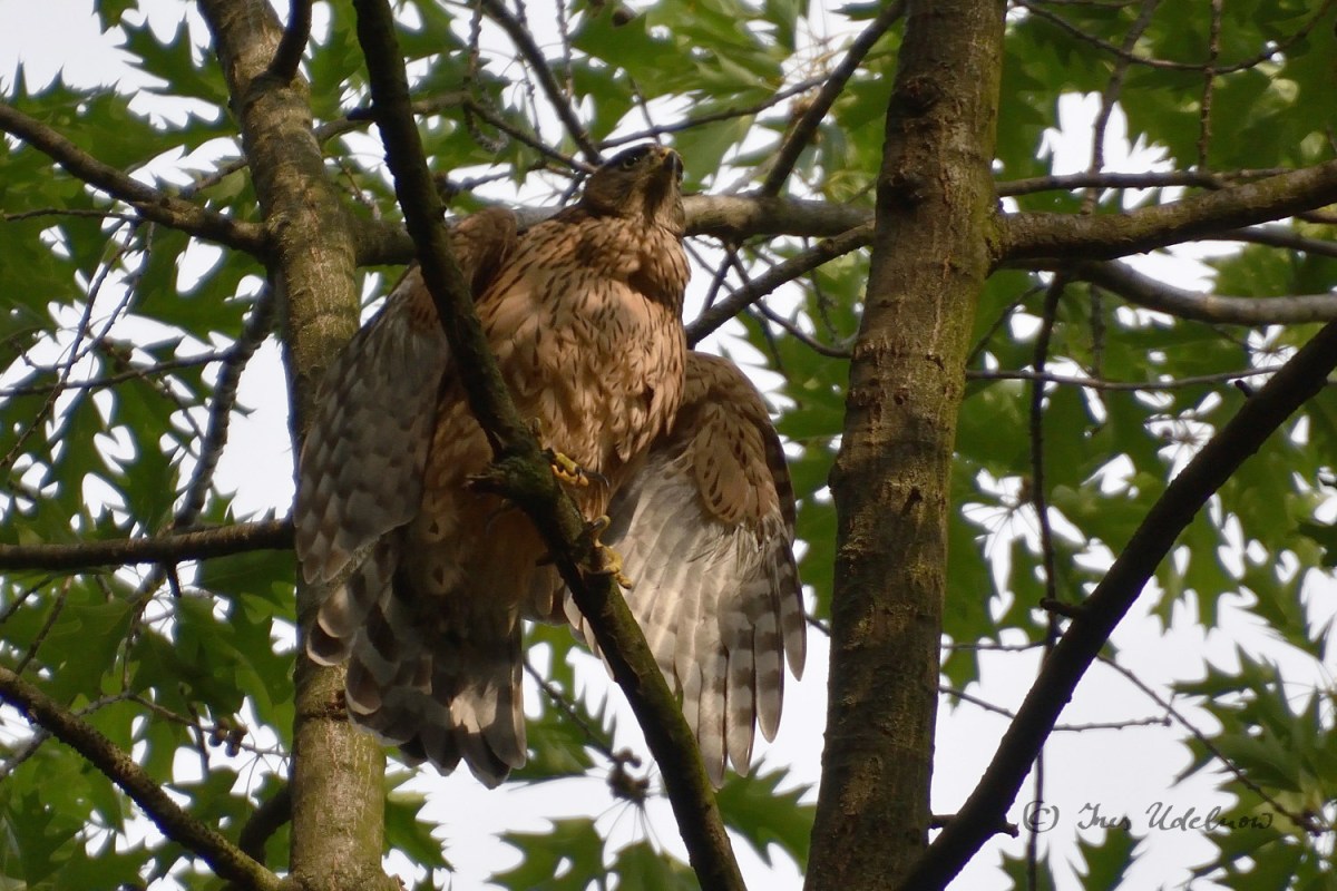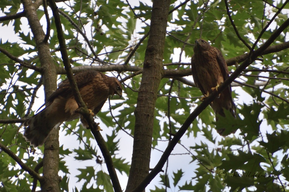 Zugegeben ist meine Kenntnis in der Vogelwelt noch sehr ausbaufähig.  Irrigerweise hatte ich anhand der ersten Fotografien der Altvögel, die mir im April gelangen, angenommen, es wären Mäusebussarde, die hier brüten. Jetzt, nachdem ich die Jungvögel gesehen, gehört und fotografiert habe, bin ich da arg ins Zweifeln gekommen und denke nun, dass es sich hier um Habichte*** handelt: die „Tropfenzeichnung“ auf dem Bauch der Jungvögel, der rotbraune Rücken, der mit breiten Streifen gebänderte Schwanz entsprechen der Beschreibung für das Federkleid der Junghabichte, das sie bis zur ersten Mauser tragen.
