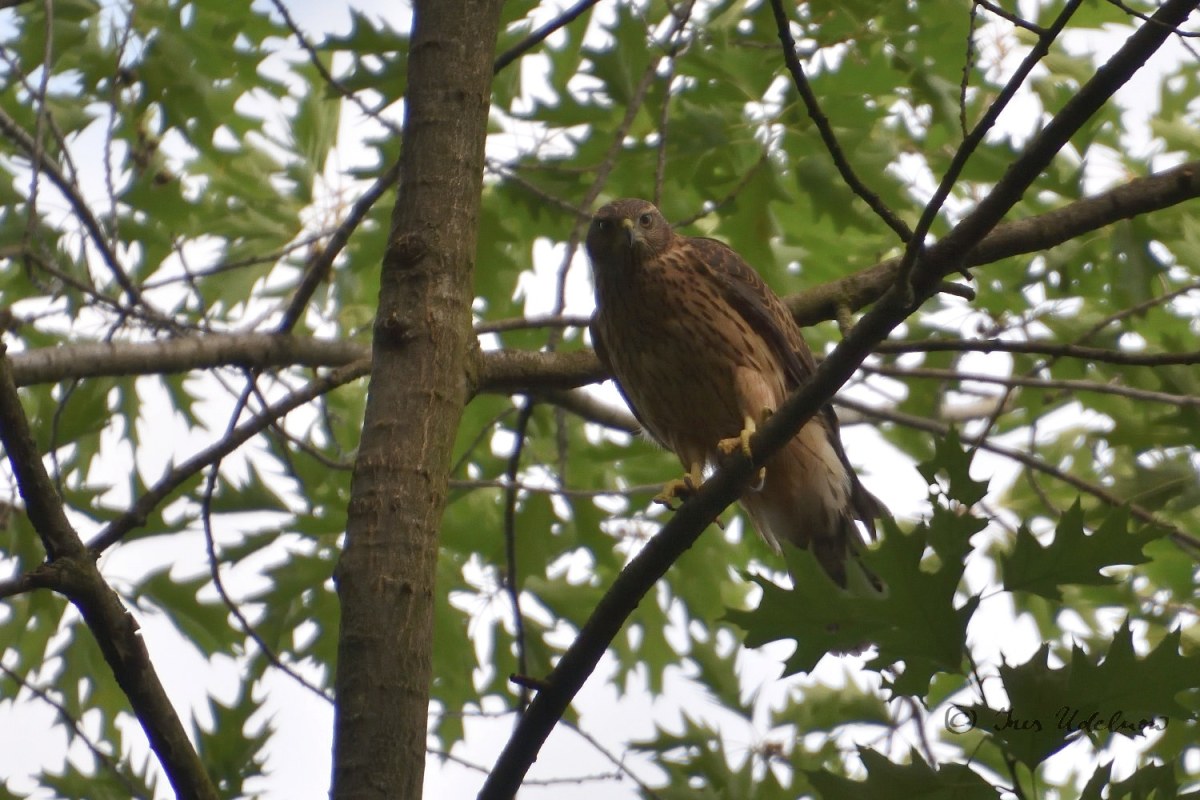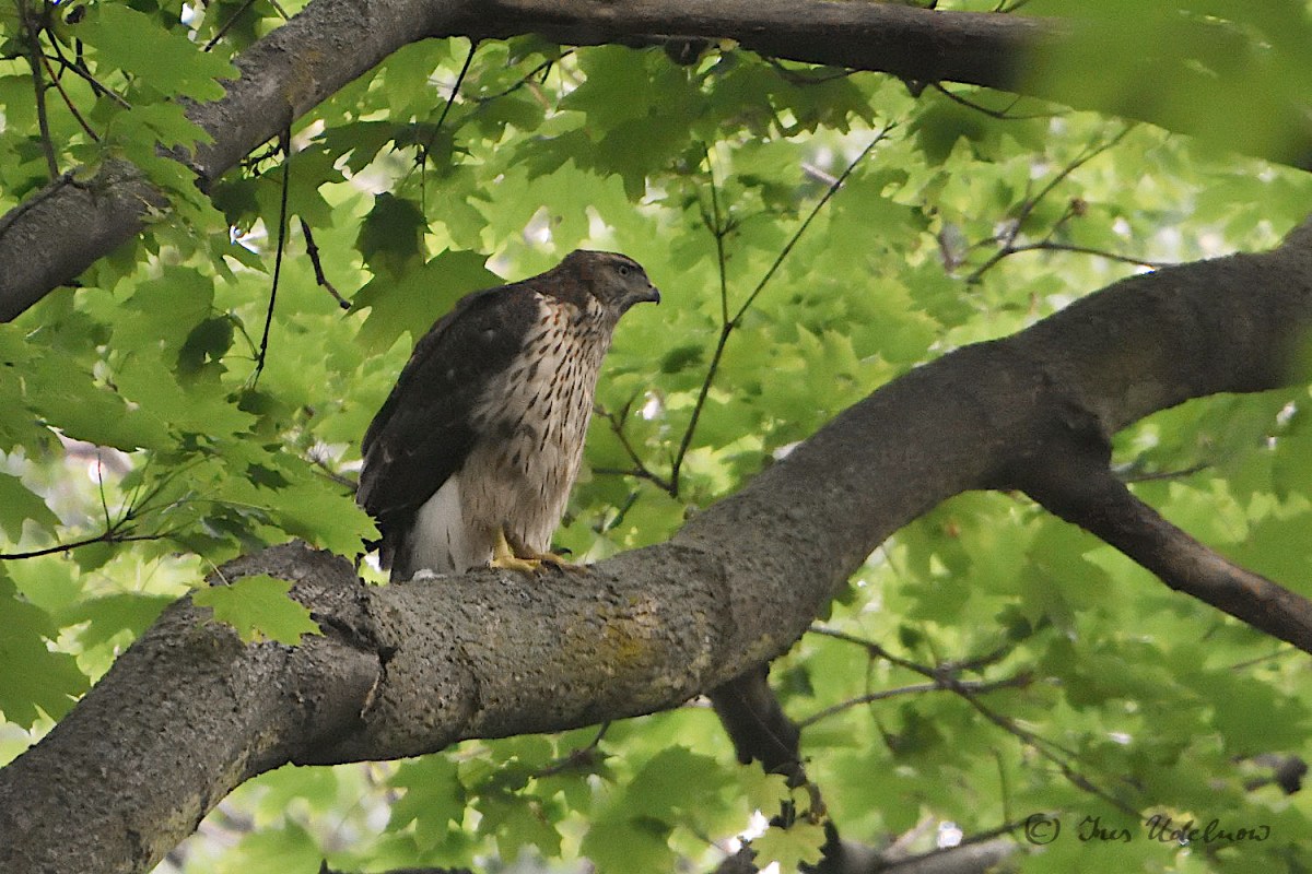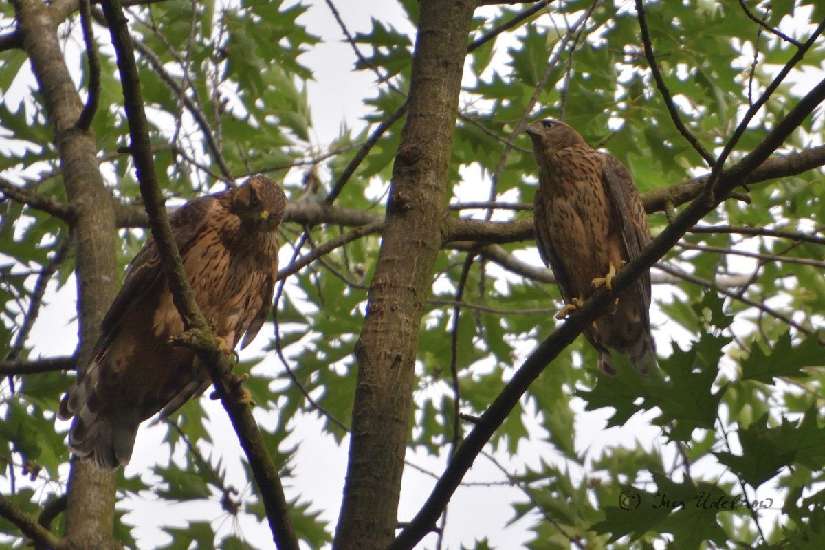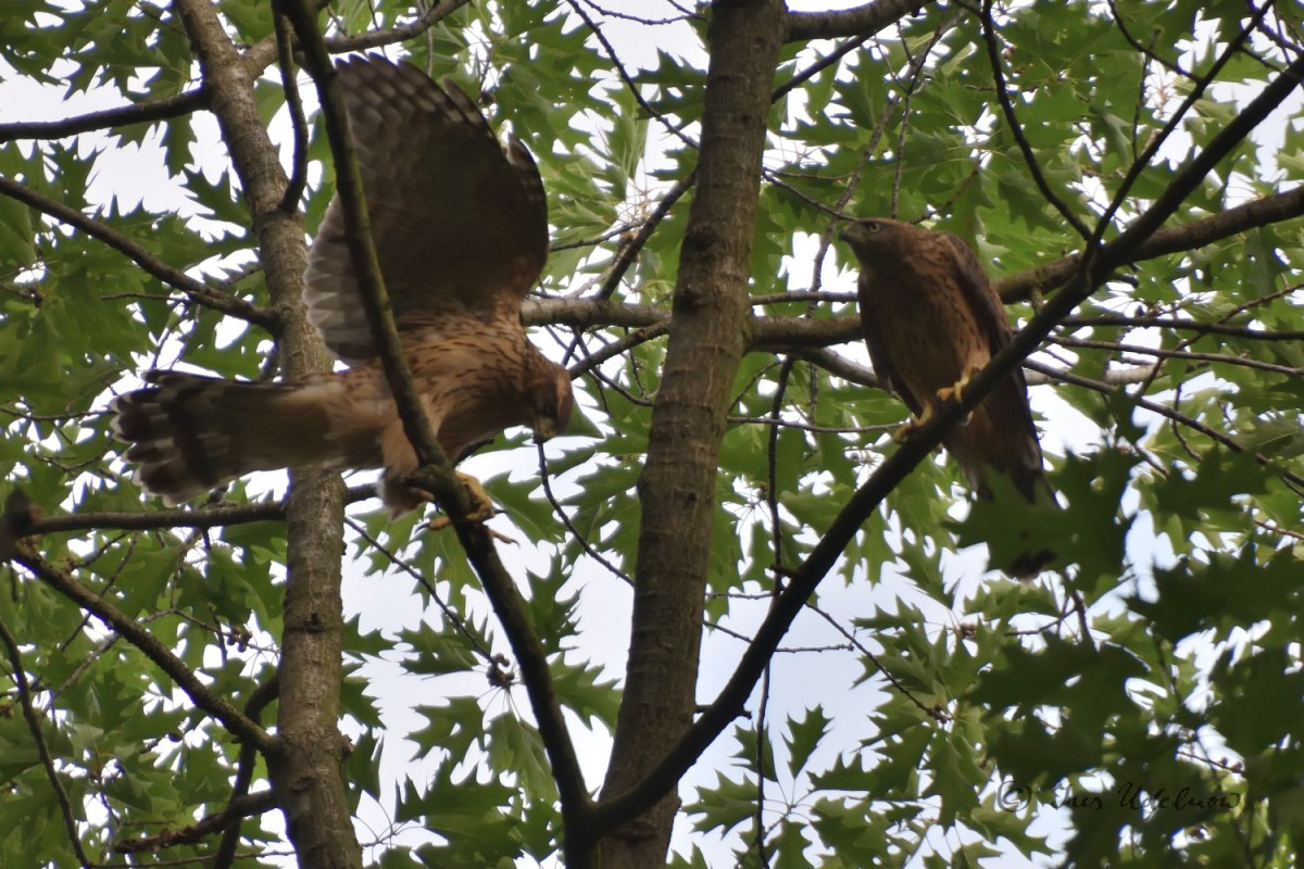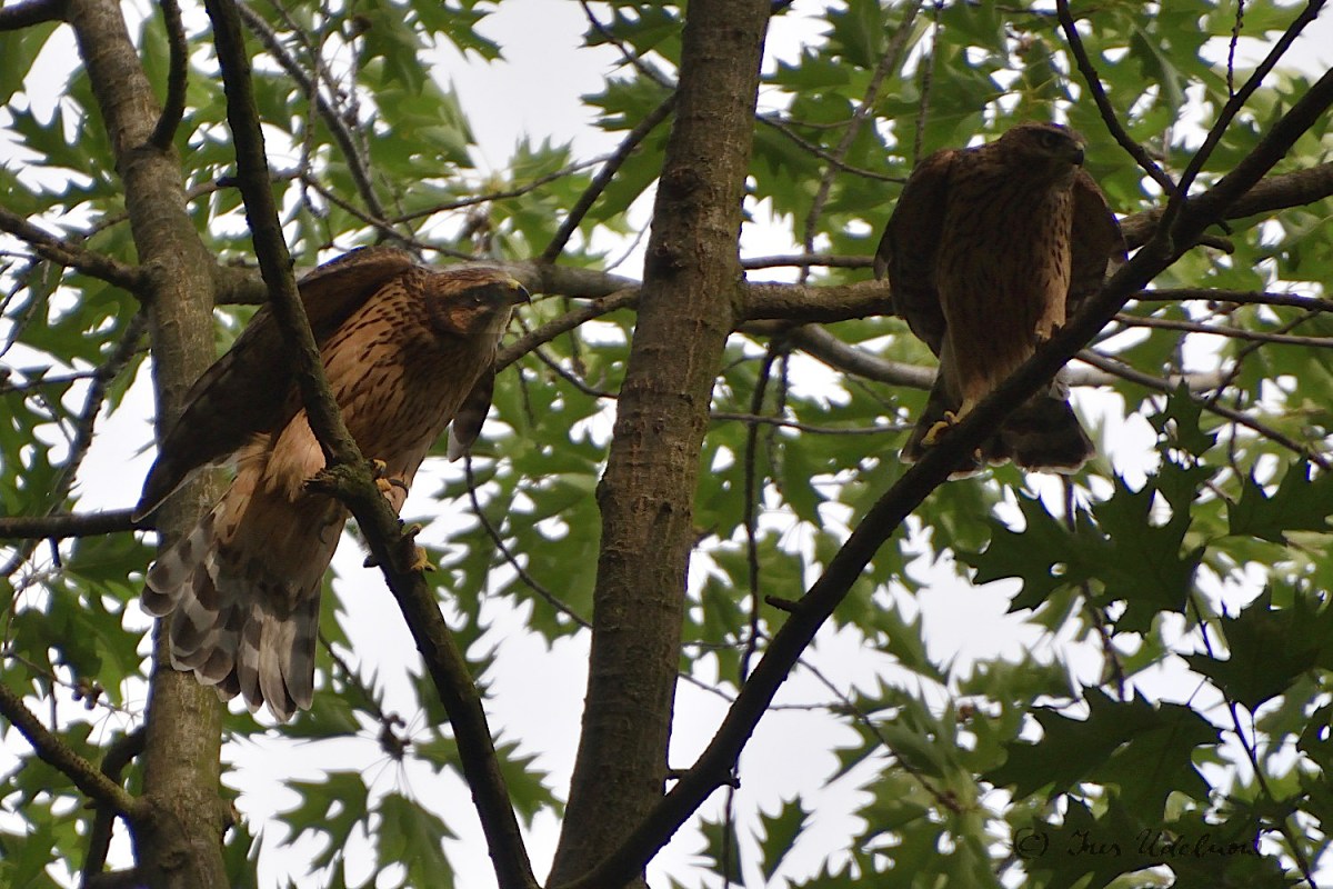 Zugegeben ist meine Kenntnis in der Vogelwelt noch sehr ausbaufähig.  Irrigerweise hatte ich anhand der ersten Fotografien der Altvögel, die mir im April gelangen, angenommen, es wären Mäusebussarde, die hier brüten. Jetzt, nachdem ich die Jungvögel gesehen, gehört und fotografiert habe, bin ich da arg ins Zweifeln gekommen und denke nun, dass es sich hier um Habichte*** handelt: die „Tropfenzeichnung“ auf dem Bauch der Jungvögel, der rotbraune Rücken, der mit breiten Streifen gebänderte Schwanz entsprechen der Beschreibung für das Federkleid der Junghabichte, das sie bis zur ersten Mauser tragen.