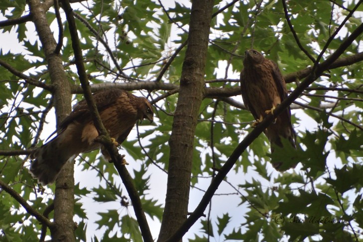 Zugegeben ist meine Kenntnis in der Vogelwelt noch sehr ausbaufähig. Irrigerweise hatte ich anhand der ersten Fotografien der Altvögel, die mir im April gelangen, angenommen, es wären Mäusebussarde, die hier brüten. Jetzt, nachdem ich die Jungvögel gesehen, gehört und fotografiert habe, bin ich da arg ins Zweifeln gekommen und denke nun, dass es sich hier um Habichte*** handelt: die „Tropfenzeichnung“ auf dem Bauch der Jungvögel, der rotbraune Rücken, der mit breiten Streifen gebänderte Schwanz entsprechen der Beschreibung für das Federkleid der Junghabichte, das sie bis zur ersten Mauser tragen. Falls Ihr da mehr Erfahrung habt und Korrekturen für habt – ich weiß, einige meiner Leser*innen sind auf diesem Felde weitaus besser bewandert als ich -, bin ich aufgeschlossen und erfreut.