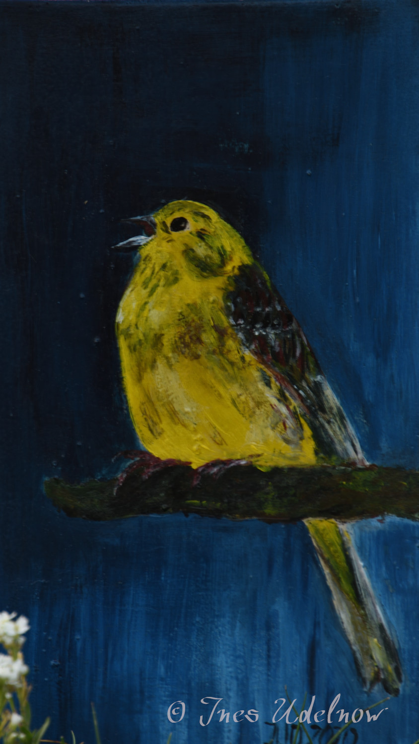Heute zeige ich den weiteren Fortgang meines Projektes der Vogelbildnisse auf Zigarrenkistenbrettchen: Eine kleine Goldammer.