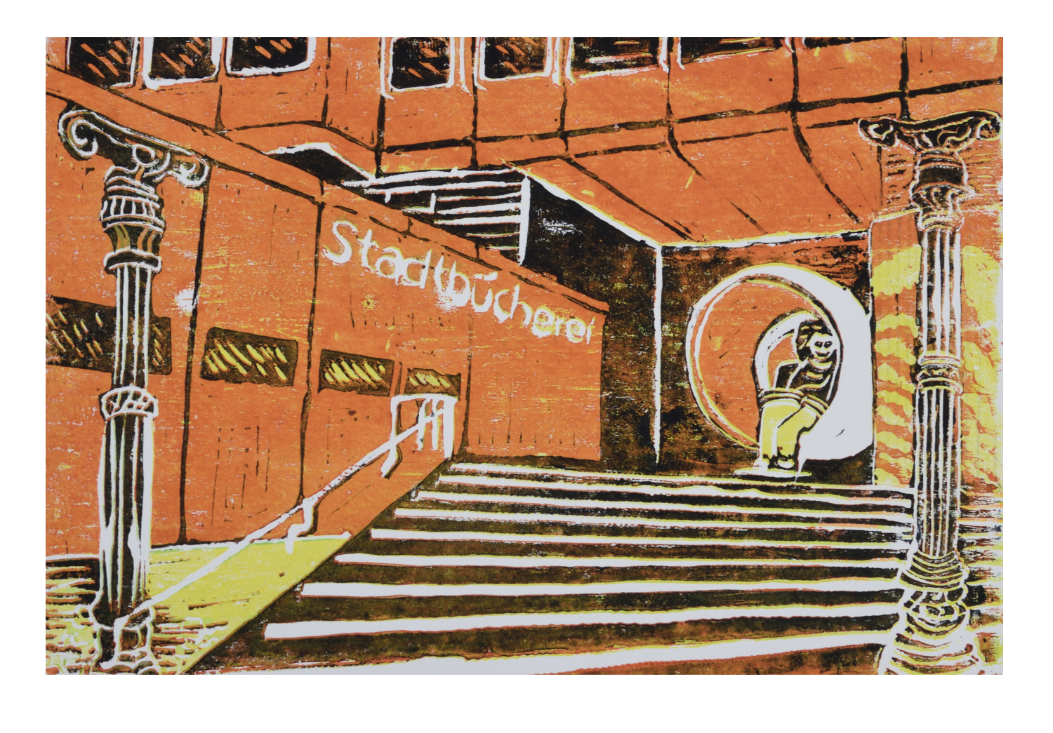 Meine alte Lieblingsbibliothek. Linoldruck, Juni 2020, © Ines Udelnow