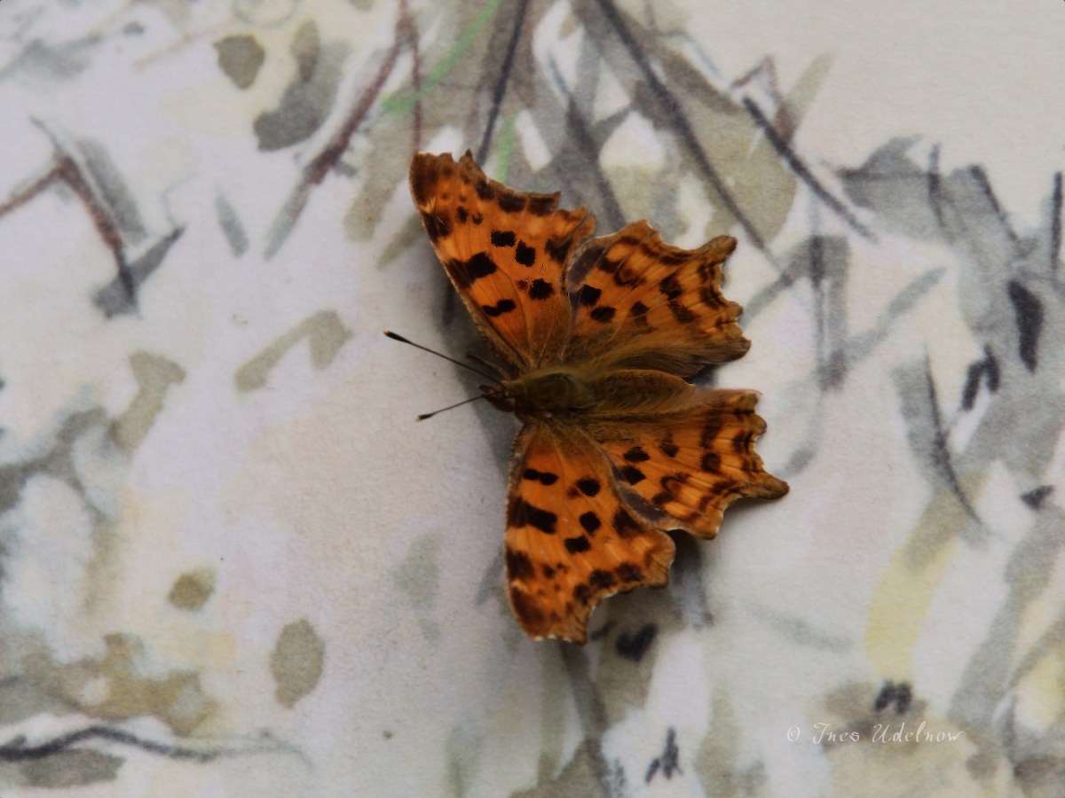 Dieser hübsche C-Falter aber möchte trotzdem gern hier vorstellt werden – dafür setzte er sich extra ganz fotogen auf eine Informationstafel zum Köppchen See im Naturschutzgebiet am Tegler Fließ, ganz als gehörte er zu einer Collage.