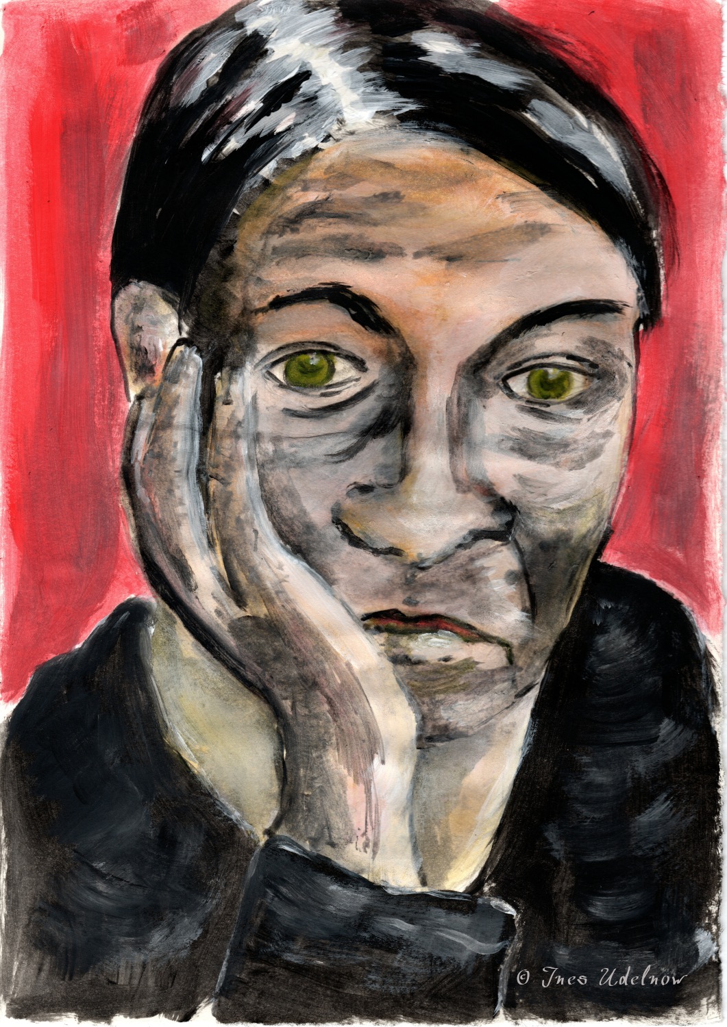 Ich hatte heute den Tag malend verbracht und parallel an verschiedenen Bildern gearbeitet. Am Abend war auf dem Teller, auf dem ich meine Gouache-Farben anrichte noch frische Farbe, übrig. Warum dann also nicht mal wieder mit etwas Farbe an das Mittwochs(selbst)portraitprojekt gehen?