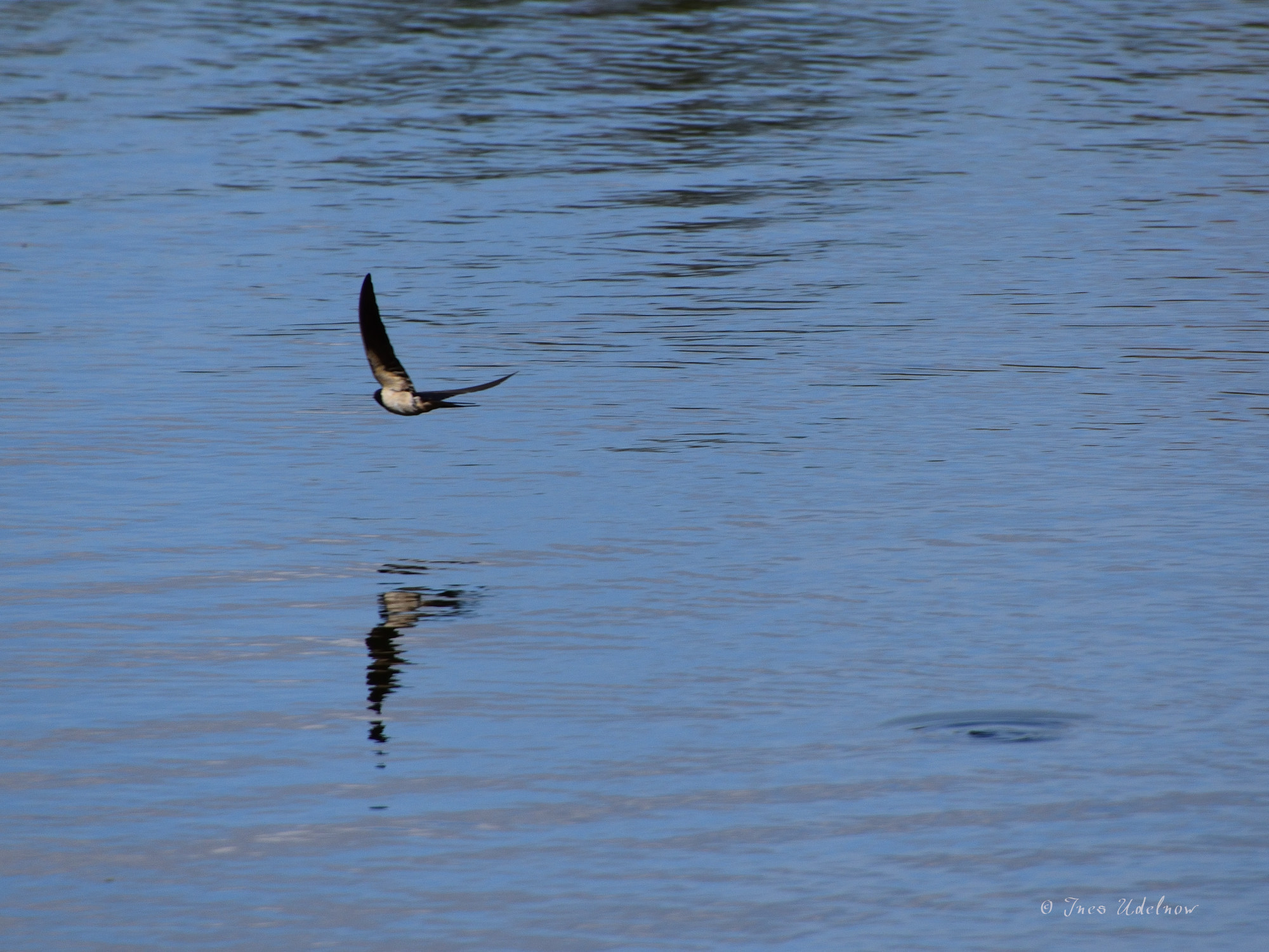 Aber diese Strecke – Teil des gut ausgebauten und ausgeschilderten Teil des >>Berlin-Kopenhagen-Radwegs<< wollen wir im Herbst zusammen noch mindestens ein weiteres Mal radeln, so gut hat es uns gefallen. Freilich werden wir dann wohl keine Schwalben mehr zu sehen bekommen und beobachten können, wie sie in atemberaubendem Tempo über dem Kanal hin- und her- und wieder herüberfliegen und dabei pfeilschnell dicht über der Wasserfläche nach Insekten haschen. Oft sind sie so geschwind, dass man nicht sie selbst, sondern erst danach die feinen Wasserringe wahrnimmt, die sie nach ihrem Sinkflug hinterlassen. Von den zich Versuchen, dieses lustige Sausen mit der Fotokamera festzuhalten, war mir damals immerhin einer gelungen. Bevor uns die Schwalben also bald gen Süden verlassen, möge ihnen heute noch einmal ein kleiner Beitag gewidmet sein.
