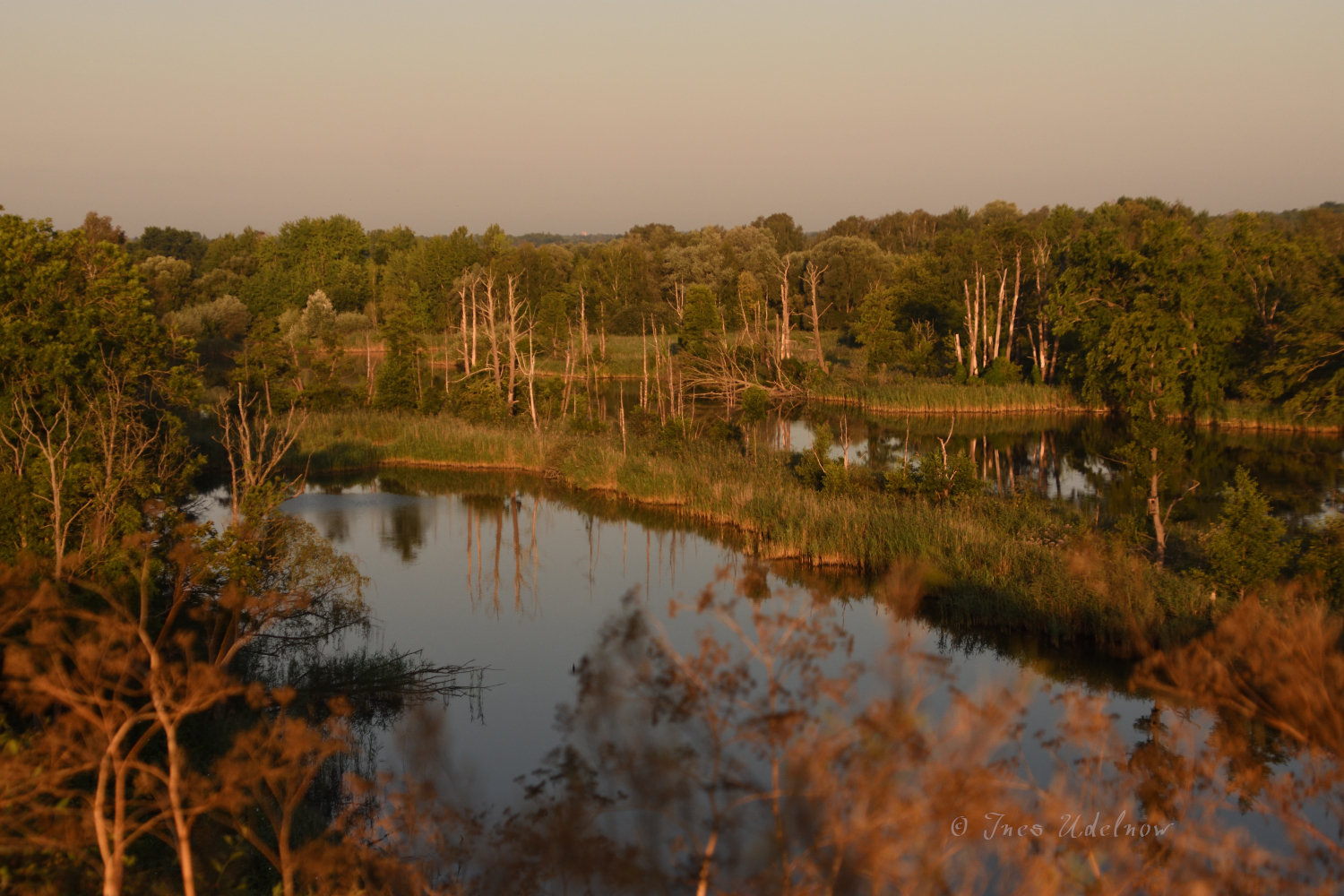 Über dem Köppchensee geht die Sonne auf. Ein Waschbär raschelt im Schilf, traut sich aber nicht näher an mich heran. Die große schwarze Gestalt am Ufer mit dem klickenden Kasten dürfte ihm sehr suspekt gewesen sein. Als es heller wird gehe ich weiter, im Halbkreis um den Köppchensee, der nun nur noch von einer erhöhren Böschung aus zu überblicken ist. Bis auf die eine Uferstelle, an der ich das erste Foto machte, ist er für Menschen unzugänglich. Was für ein Naturparadies!
