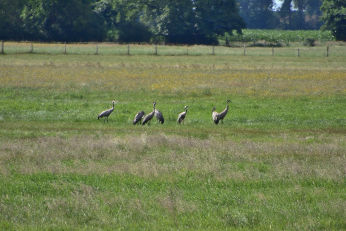 Es wird Herbst, die Kranichzugsaison beginnt. Ob ich es in diesem Jahr nach Linum oder einem anderen Ort schaffe, wo ich den abendlichen Kranicheinflug beobachten kann, steht noch in den Sternen. Immerhin habe ich im Sommer auf einem Fahrradausflug im Norden Brandenburgs auf einem Feld einige dieser wundervollen Vögel sehen können – für Großaufnahmen mit dem Fotoapparat zwar etwas weit entfernt. Erhebend war ihr Anblick allemal.