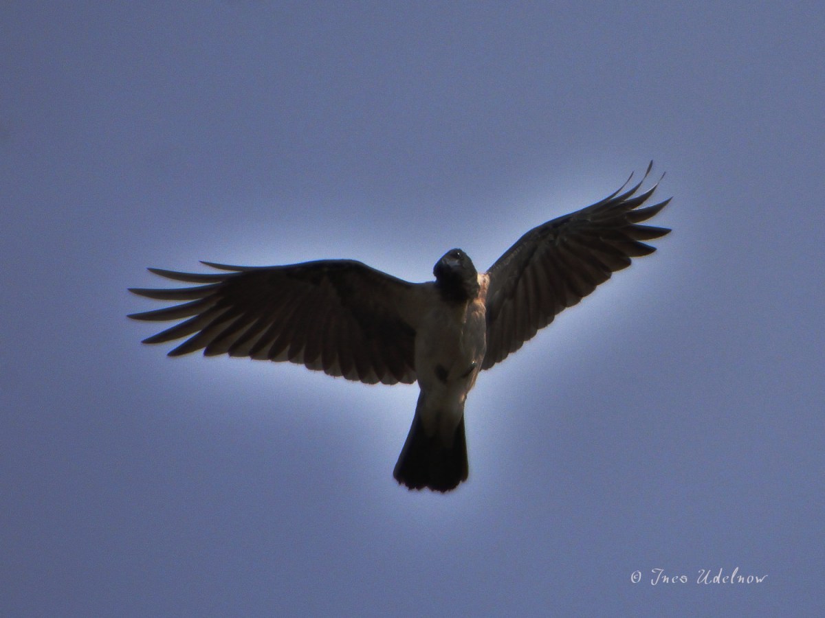 Wirkt sie nicht wie ein emporschwebender Engel, die Nebelkrähe auf dem ersten Foto? Den hellen Rand um ihre Kontur habe ich nicht per Bildbearbeitung hinzugefügt – lediglich durch Verstärkung von Helligkeit und Kontrast betont.