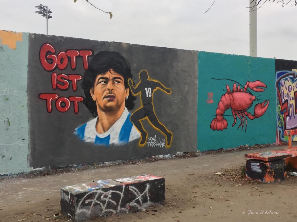 Dass ich momentan ohne mein Fahrrad unterwegs bin, hat immerhin einen Vorteil: ich mache öfter mal einen Schlenker im Mauerpark den kleinen Hügel hinauf und schaue mir an, was dort derzeit öffentlich an Kunst entsteht. An Tagen wie heute, grau und trüb, ist es corona-sicher-einsam und niemand verstellt den Blick auf die Mauerkunst. Und da mit dem Handy zu fotografieren weiterhin funktioniert, habe ich ein paar aktuelle Fotos mitgebracht. Die Hommage auf Maradonna stammt übrigens wieder aus der Feder (Spraydose) des hier im Blog mehrfach schon erwähnten Künstlers ©emefreethinker.