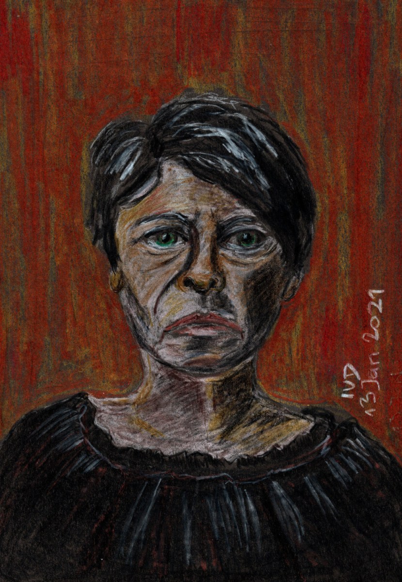 Heute habe ich mein Zeichenpapier ein wenig sortiert und zwischen diversen losen Blättern schwarzen dünnen Karton gefunden, der vermutlich einst Deck- oder Zwischenblatt eines Kalenders war. Und weil Mittwoch ist und somit die wöchentliche Selbstbetrachtung mittels Selbstportrait ansteht, habe ich dieses Papier genommen und die Wirkung meiner Buntstifte auf schwarzem Grund beim Portraitzeichnen ausprobiert. Nicht dass das Ergebnis sonderlich „lieblich“ geworden wäre, aber ich bin positiv überrascht von Leuchten der Farben und der dadurch möglichen Ausdruckskraft.