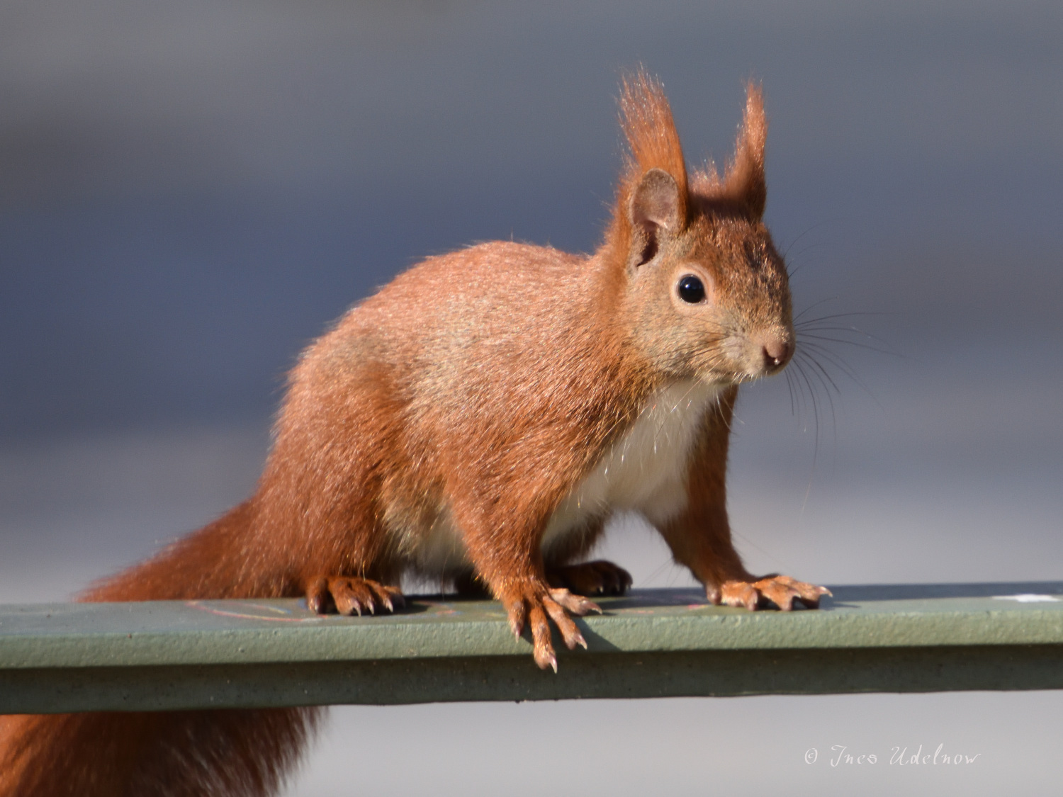 Heute war ein phantastischer Tag, des Wetters wegen, aber auch weil ich überdurchschnittlich viele Tiere beobachten und bei ausreichend Licht fotografieren konnte. Mir portraitsitzende Nebelkrähen, ein turtelndes Kolkrabenpaar, dessen Gefieder in der Sonne glitzerte, balzende Habichte, von den „üblichen verdächtigen“ Vögelchen wie Rotkehlchen, Buchfinken, Kleibern, Meisen, Sperlingen und Amseln etc., die fast immer zu sehen oder zu hören sind, will ich gar nicht erst schreiben. Nur die Graureiher fehlten. Ein Eisvogel zog meine Aufmerksamkeit derart auf sich, dass ich den Bieber im Wasser unter ihm fast übersehen hätte. Alle die Bilder des heutigen Tages will ich noch in Ruhe sichten (die gestrigen sind auch noch nicht ausgewertet) und eventuell das eine oder andere zeigen. Aber dieses Foto eines hungrigen Eichhörnchens, das überhaupt nicht menschenscheu in einem Meter Entfernung zu einem Radfahrer seelenruhig von den gestreuten Nüsschen naschte und lediglich den Nebenkrähen, die ebenfalls auf die Nüsse Anspruch erhoben, gegenüber Respekt zollte und ihnen kurzzeitig die gedeckte Tafel überließ, soll zu Eurem – vor allem aber zu meinem – Vergnügen ein kleiner Appetithappen sein.