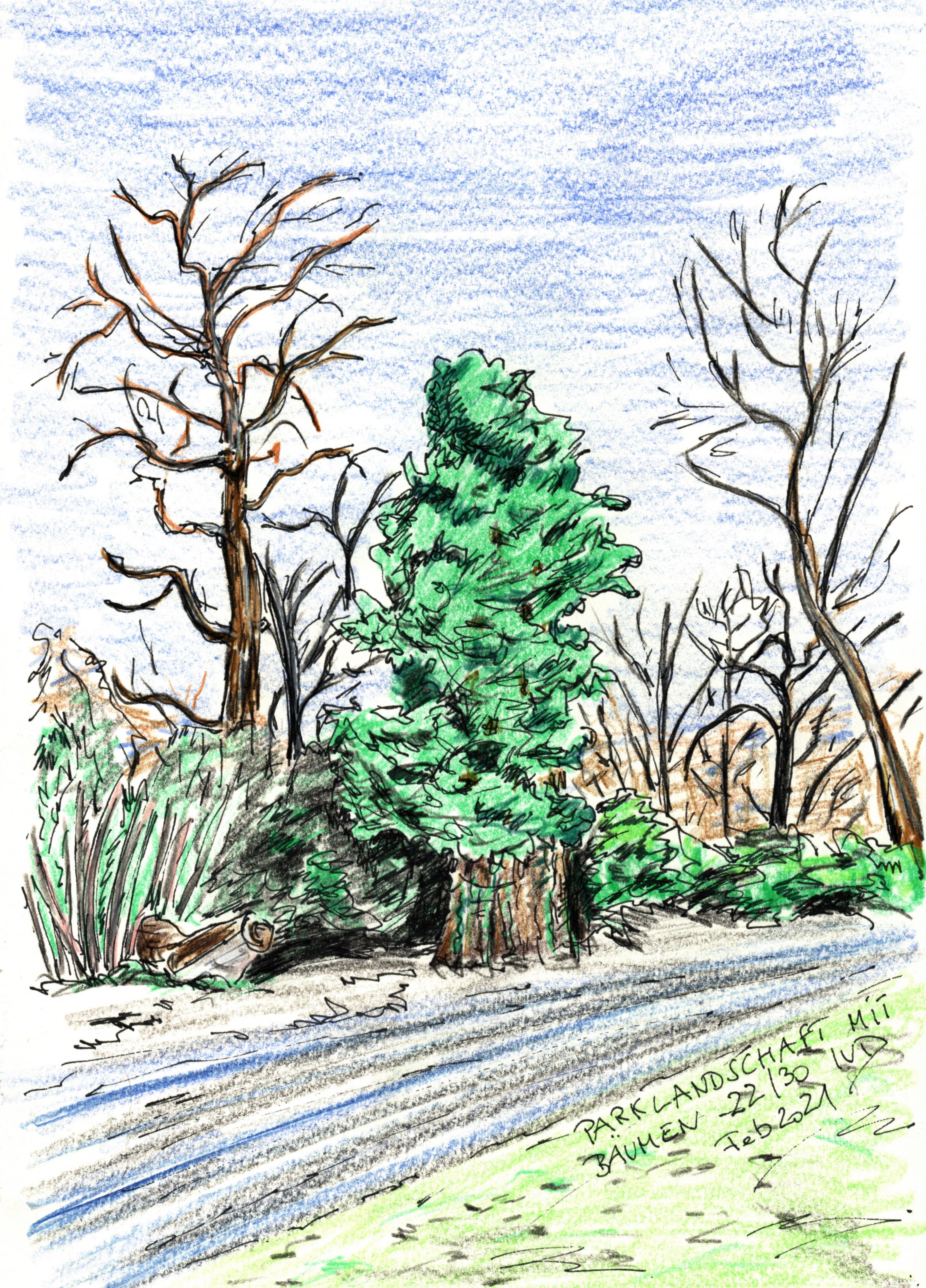 Baum 22, vermutlich der Stamm einer alten Platane aus dem Schlossgarten Niederschönhausen in Pankow (Berlin), mit Efeu bewachsen. Zeichnung mit Buntstiften auf Skizzenpapier A4.