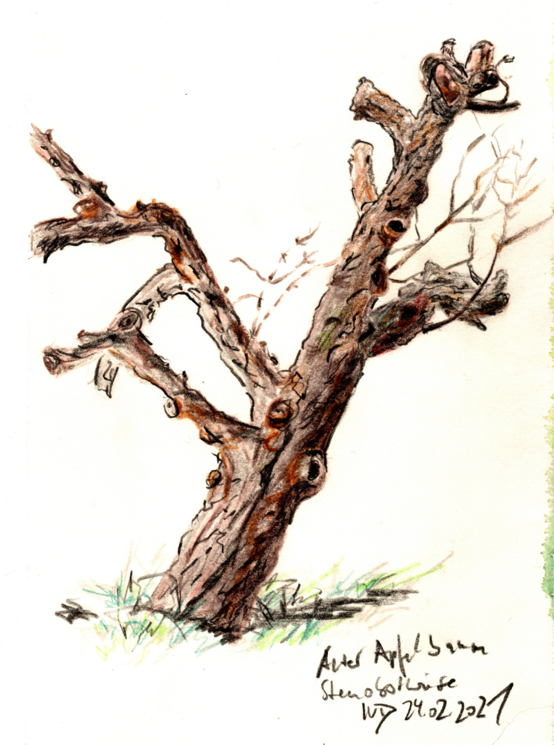 Hier zeichnete ich – bereits am Mittwoch und auch draußen vor Ort – einen der alten Apfelbäume auf einer der Streuobstwiesen im Norden Berlins zwischen Blankenfelde und Lübars. Hübsch sind sie, die alten Wiesen mit den verhutzelten Bäumen, die meisten für Menschenbeine nicht zu betreten und somit Rückzugs- und Schutzgebiet für alles was fleucht und kreucht.