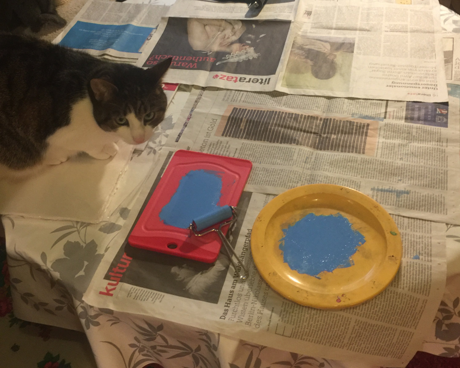 Entstanden ist der Linolschnitt nach dem Prinzip der verlorenen Platte im Format A5. Am Ende waren insgesamt drei Mehrfarbdrucke entstanden, mit denen ich zufrieden war. Ursprünglich hatte ich vorgehabt, die einzelnen Arbeitsschnitte dotografisch zu dokumentieren, habe das aber während des Arbeitens oft vergessen. Immerhin ein paar Impressionen aus meiner Druckwerkstatt kann ich hier trotzdem zeigen …
