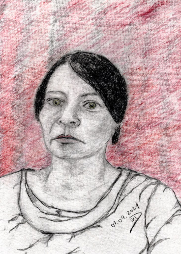 Die Zeichnung nimmt Bezug auf das >>Selbstportrait mit rotem Tuch<< vom 9. April 2020.