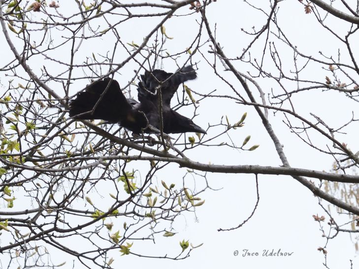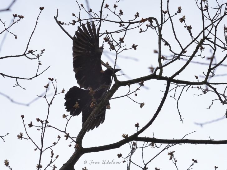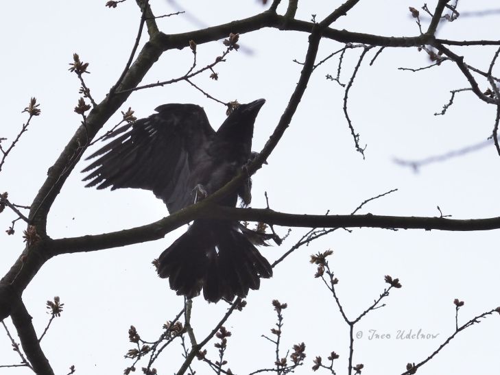 Heute sah ich nur noch ein Kolkrabenjunges im Nest. Die anderen waren bereits ausgeflogen und hockten hoch oben auf Bäumen in der Umgebung. Einem Jungvogel kam ich recht nahe (ohne ihm auf die Pelle rücken zu müssen – eine Fahrrad-Park-Tangente führt gleich neben dem Nest vorbei und auf der Wiese darunter ist regelmäßig Betrieb) und konnte ihm beim Flügelschlagtraining beobachten und ablichten.