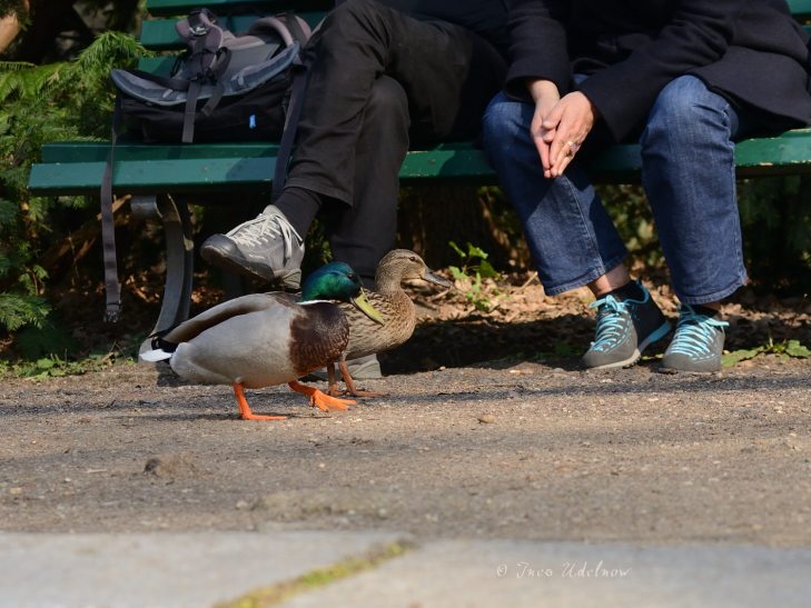 Die beiden Stockenten zieht es zurück zum Ufer. Selbstbewusst watscheln sie an Land. Dass dort Menschen sitzen, stört sie kein bisschen. Sich in keinster Weise um irgendwelche Mindestabstände scherend, flanieren sie dicht an uns vorbei. Sie wissen – irgendwann sind die Parkbesucher gegangen und dann gehört der See wieder den Stadttieren allein.