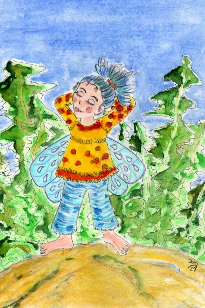 Mit einer frischen Zeichnung des kleinen Feen-Kobold-Elfenmädchens (sie mag sich da in keine Schubladen pressen lassen, hat sich aber neulich bei mir Flügel gewünscht, damit sie mit Schmetterlingen und Vögeln umherfliegen kann) kommt hier ein kleiner Gruß zum Sonntag. Habt eine schöne Zeit!